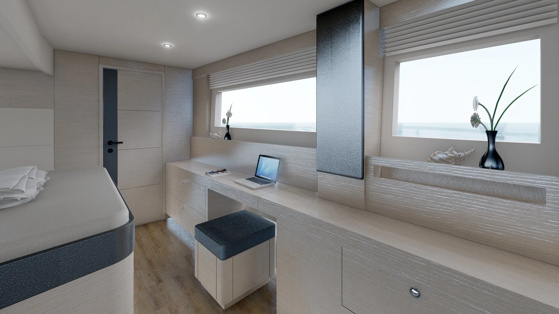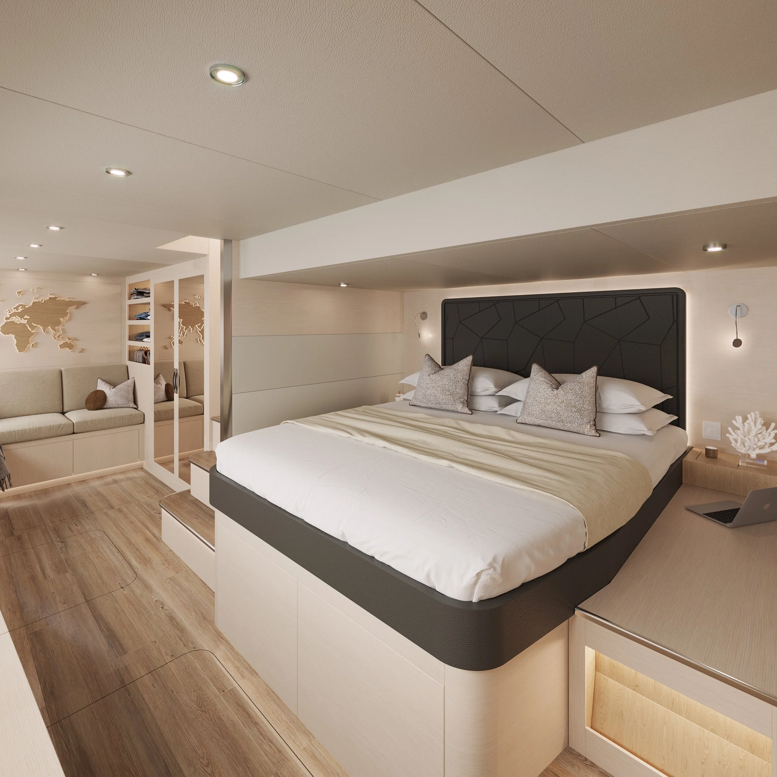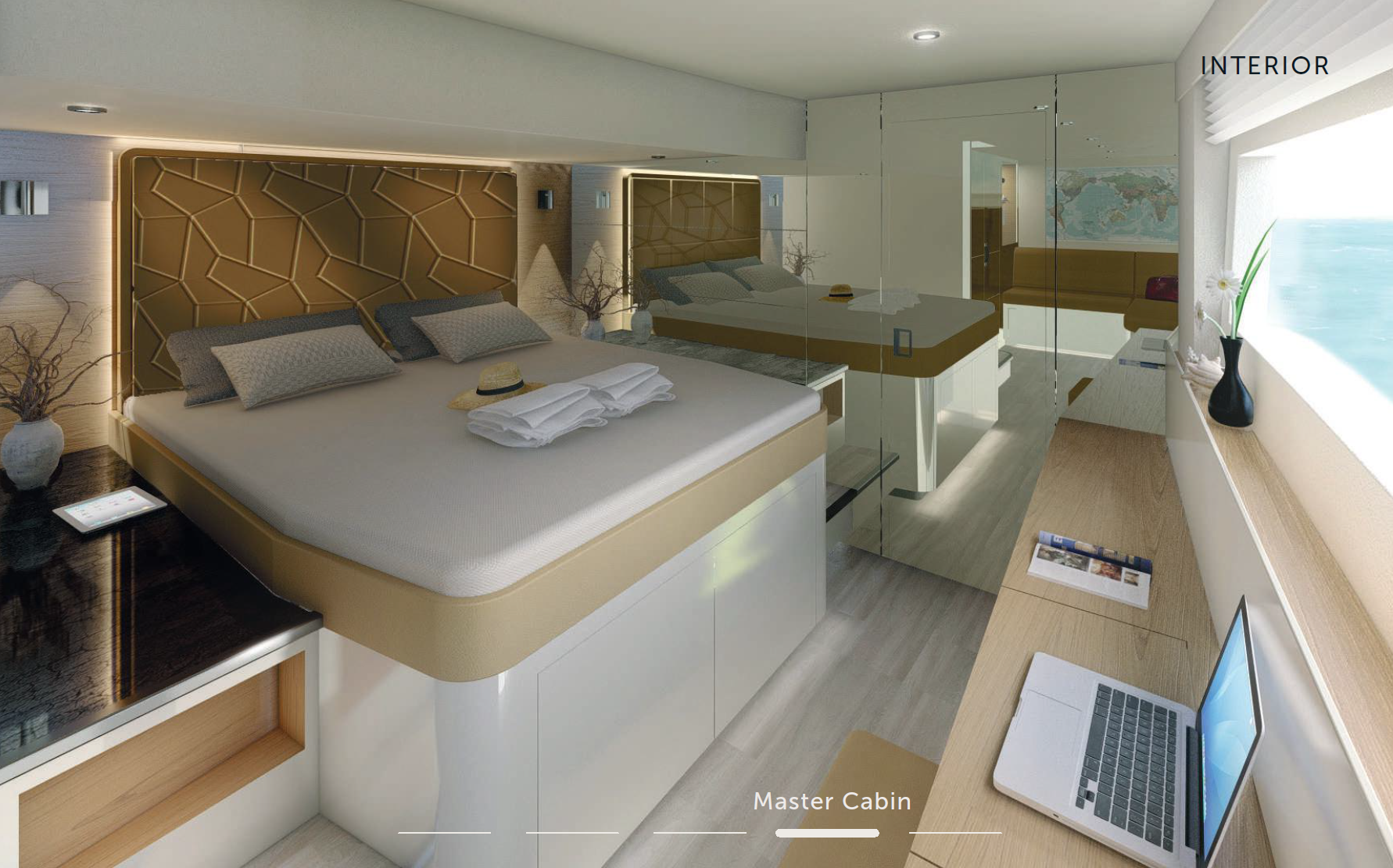 Interior furniture is made of stiff and lightweight composite plates with real wood-veneer. This reduces the weight significantly to about half the weight of a conventionally constructed and powered yacht.