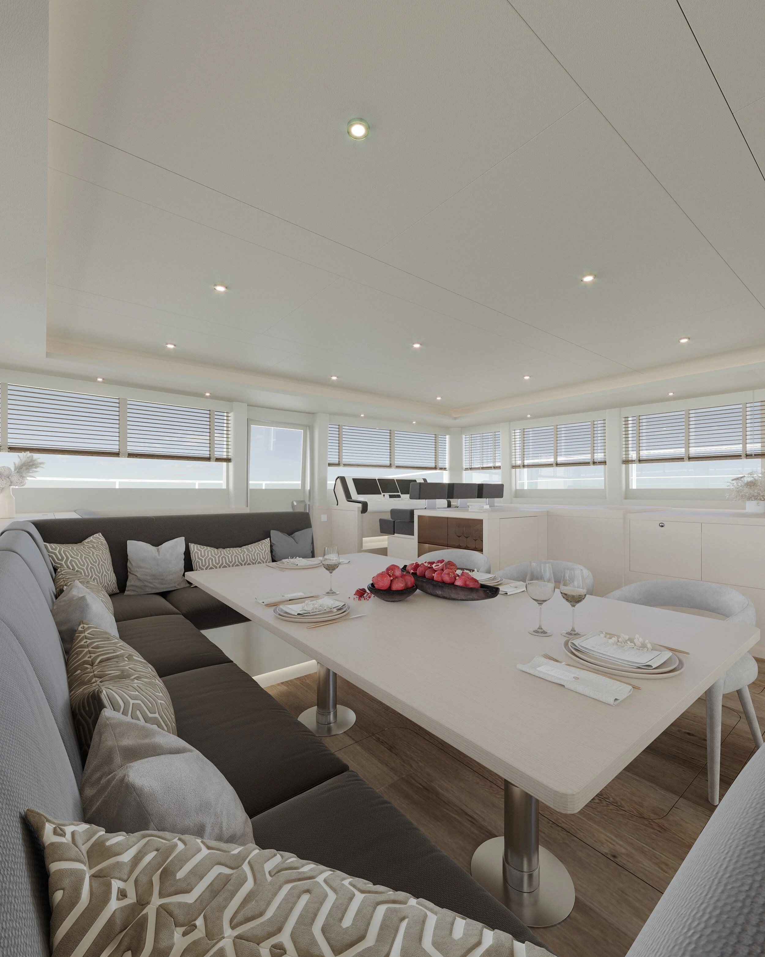 Salon and cabins are wrapped in thermal insulation. Furthermore, all windows are shaded by either the roof and/or the hull, thus lowering the energy consumption needed to keep the interior at a comfortable temperature.